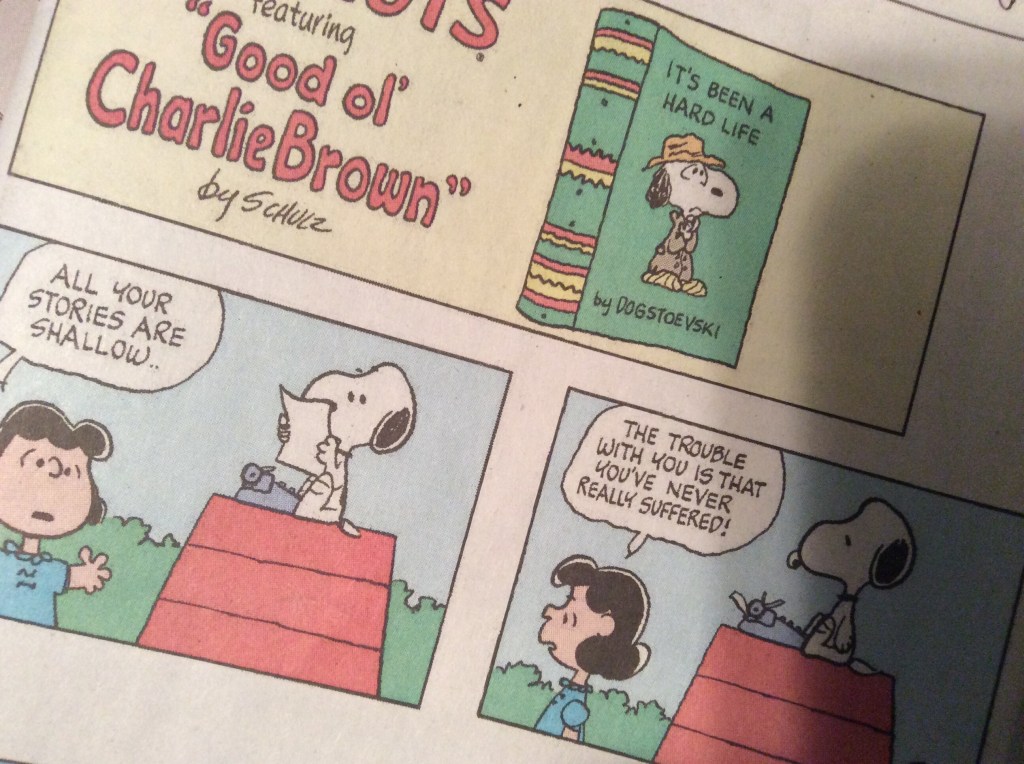 In the Peanuts cartoon, Lucy complains that Snoopy’s story about suffering is shallow, meaning it’s not believable. She accuses him of having not suffered enough to get it right.