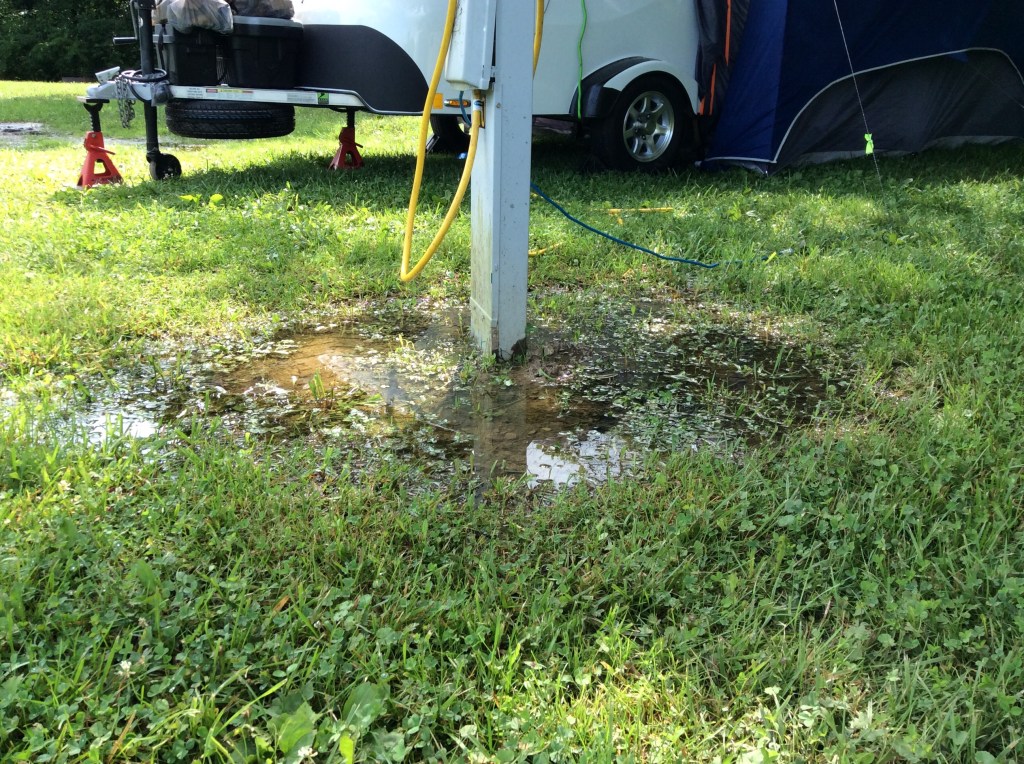 - Electricity surrounded by water. Everyone knows that water and electricity spell a big shocker. Today I saw the pedestal for our campsite electric hookup surrounded by water. Hmm, that could spell more trouble than a night of torrential downpours.