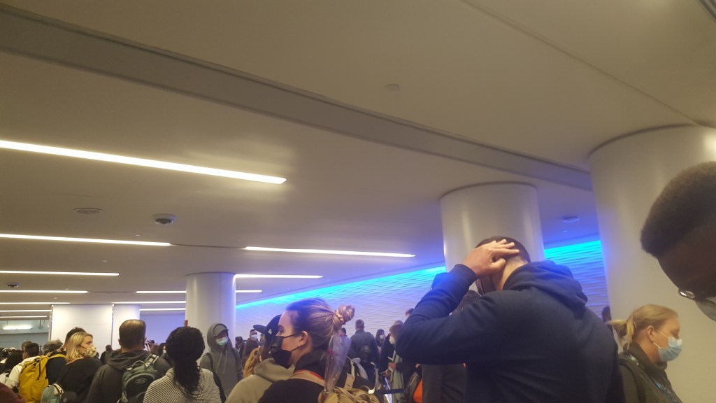 3. 100’s of people herded like cattle…willingly. Maybe someone in airport crowd control has a twisted sense of humor. The beginning of the security check line looked like a confusing maze of multiple lines heading to eight actual security check points. It’s an optical illusion. There’s only one line and you’re on it for a good twenty minutes. Lanes of black canvas ribbon snake through the an area the size of a banquet hall before looping back and narrowing to the heads of the eight check points. The sick thing is, as you near the endpoint, the line passes right by those who are just beginning. Their faces are hopeful, seeing the check points just a few feet away. In just a few more feet, they will figure it out. They’re being sent on the detour of a lifetime. I get it. It’s the only way to keep hundreds of people orderly and not standing still, ready to blow a fuse because they can’t get through Security to their flight that will leave in ten minutes. They weren’t joking when they said show up two hours before your flight boarding time.